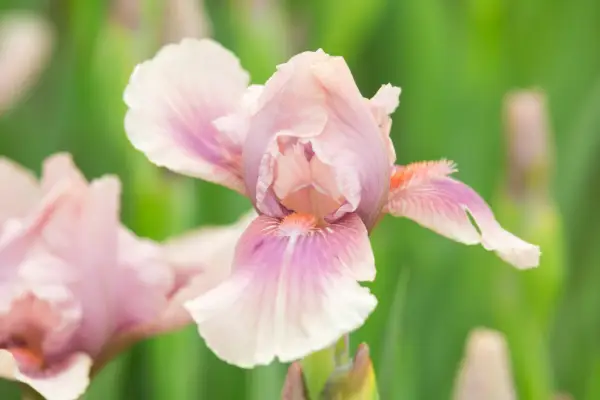 Irys „Blush malinowy”: dusky pale-pink standards and pale-purple blushed falls with a bright orange beard