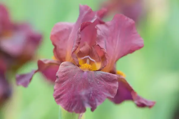 Pośrednia brodata tęczówka, Irys 'Burzliwy' Uderzające standardy w kolorze miedzi i głębokie czerwone upadki. Krótszy łodyga sprawia, że jest przydatny na zbocza lub w wietrznych obszarach. Rozkwit na początku do połowy sezonu, w maju, wysokość 50 cm.