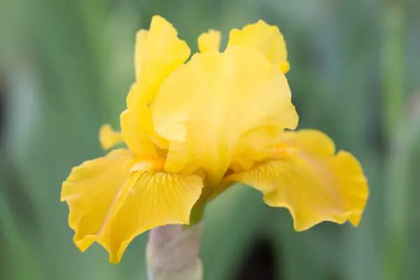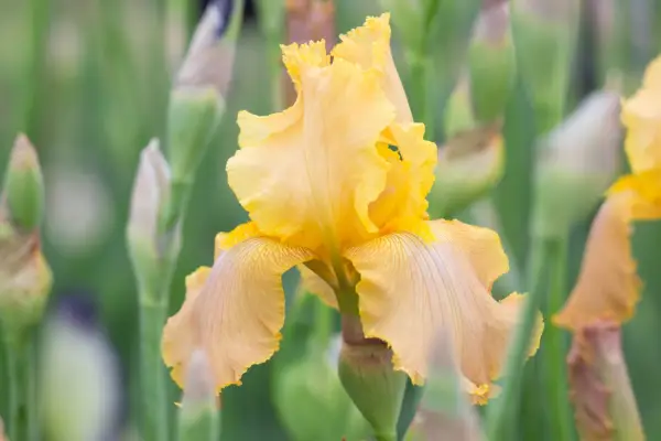 Pośrednia brodata tęczówka, Irys „Minted Gold” nadaje się do sadzenia na zboczach lub na wietrznych obszarach. Standardowe i jesienne płatki mają jasne złoto, z pomarańczowymi brodami. Rozkwit w połowie do późnego sezonu, od maja do czerwca, wysokość 60 cm.
