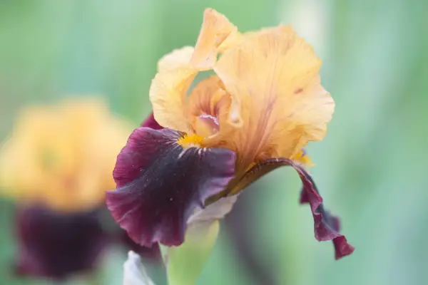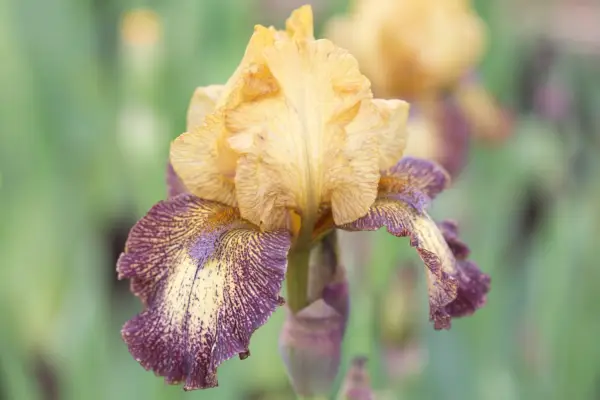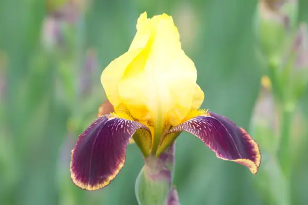 Wysoka brodata tęczówka z gładkimi płatkami, Irys 'Postać' has bright yellow standards, contrasting with the rich, bronze-purple falls, each of which have a fine gold edge. Mid- to late-season flowering, from May to June, and grows to approximately 75cm.