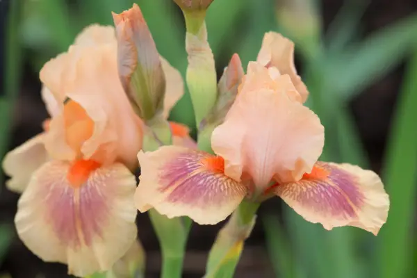 Irys „Różowy przed”: peach and purple petals with a vibrant coral-red beard