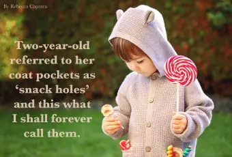 - Dwulatka określiła kieszenie jej płaszcza jako dziury na przekąskę i tak na zawsze będę je nazywać. - Rebecca Caprara