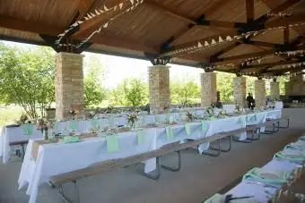 Jeśli przyjęcie odbędzie się w schronie parkowym lub namiocie, będziesz chciał odpowiednio udekorować. Zacznij od sufitu i zejdź w dół.