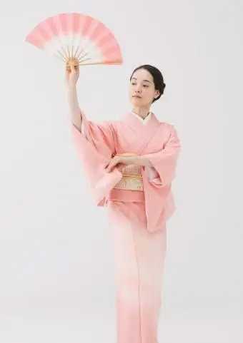 - Aby przedstawić mężczyznę, przyjmij podstawową postawę chodu i odwróć palce stóp na zewnątrz, z dala od siebie. Chwyć brzegi rękawów kimona małymi palcami, umieść kciuki na palcach wskazujących, zatop się w biodrach, opuść ramiona, wysuń łokcie i dłonie w kierunku linii środkowej i idź.
