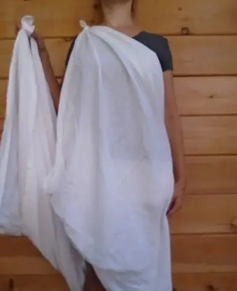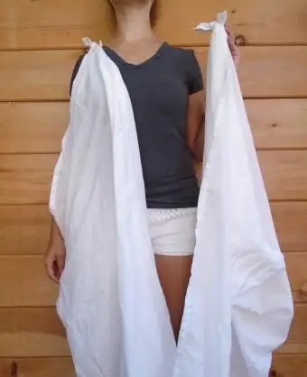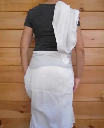 - Weź drugą część wiązaną i przeciągnij całe prześcieradło przez przód ciała, wokół pleców i z powrotem do przodu ciała.