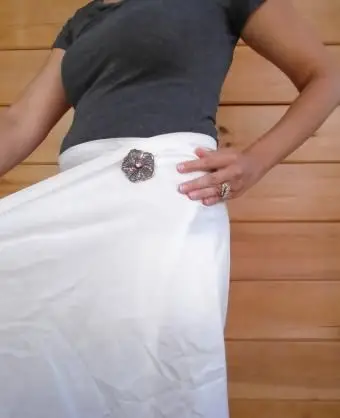 - Weź róg z metką i przytrzymaj go na lewym biodrze tak, aby metka dotykała twojego ciała, a dłuższy bok prześcieradła był w talii.