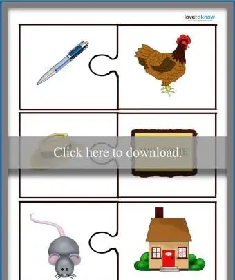Wydrukuj darmowa gra w dopasowywanie do druku jak ta gra Rhyme Puzzle Matching. Każda mini łamigłówka składa się z dwóch części, a obraz na każdym kawałku rymuje się z obrazem na drugim. Jeśli potrzebujesz pomocy przy pobieraniu materiałów do druku, sprawdź tepomocne wskazówki.